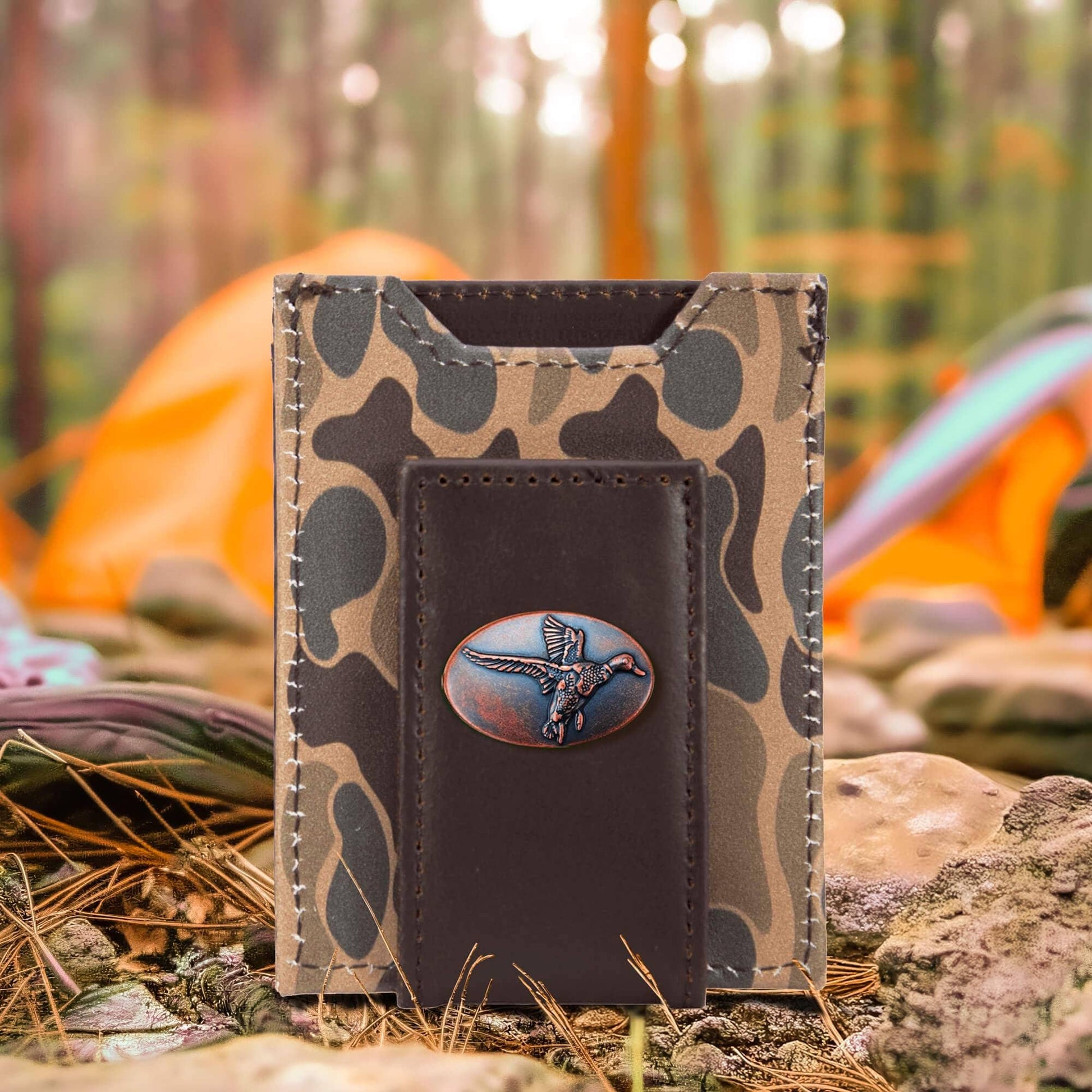 Show your Mallard passion with an original Zep-Pro Old School Camo leather front pocket wallet. The bird imagery on these wallets taps into our intrinsic connection to nature and wildlife. It is a stylish and unique way to show enthusiasm while keeping important cards and cash organized. This Zep-Pro wallet is constructed of full grain leather with a Old School Camo print and features the Mallard design, proudly displayed on the front. The metal concho emblem has an antique copper finish which perfectly accents this unique wallet. The magnetic front pocket slim design provides ample space for cards, ID, and cash, while the leather gives it a natural appearance. Additionally, the combination of the Mallard design, along with the rich texture of genuine leather, creates a visually captivating item. This wallet is a great gift for outdoor enthusiasts. Whether it’s for graduation, birthday, or other special occasion, this front pocket magnetic wallet will be appreciated for years to come.