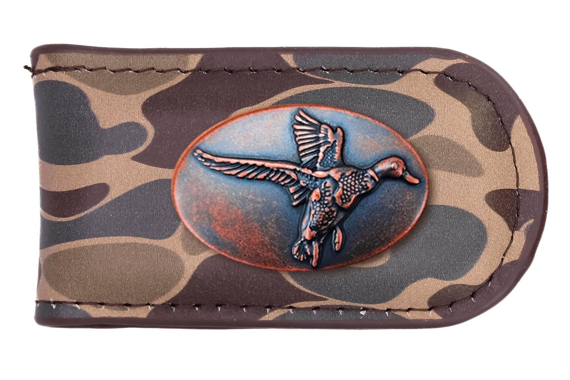 Show your passion with an original Zep-Pro Old School Camo leather money clip featuring a Mallard design. The duck imagery on these wallets taps into our intrinsic connection to nature and wildlife. It is a stylish and unique way to show enthusiasm while keeping important cards and cash organized. This Zep-Pro wallet is constructed of full grain leather with a Old School Camo print and features a Mallard meatal logo, proudly displayed on the front. The metal concho emblem has an antique copper finish which perfectly accents this unique wallet. The magnetic money clip design provides a strong closure for cards, ID, and cash, while the leather gives it a natural appearance. Additionally, the combination of the Mallard design, along with the rich texture of genuine leather, creates a visually captivating item. It combines visual aesthetics, elegance, craftmanship, durability, and the opportunity for self-expression in a single accessory.