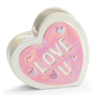 Tilted white heart shape with raised hearts on front. Recessed messages in center. All over an iridescent finish. Hearts read different messages. One in lavender reads: "XO", and one in pink reads: "Love U".