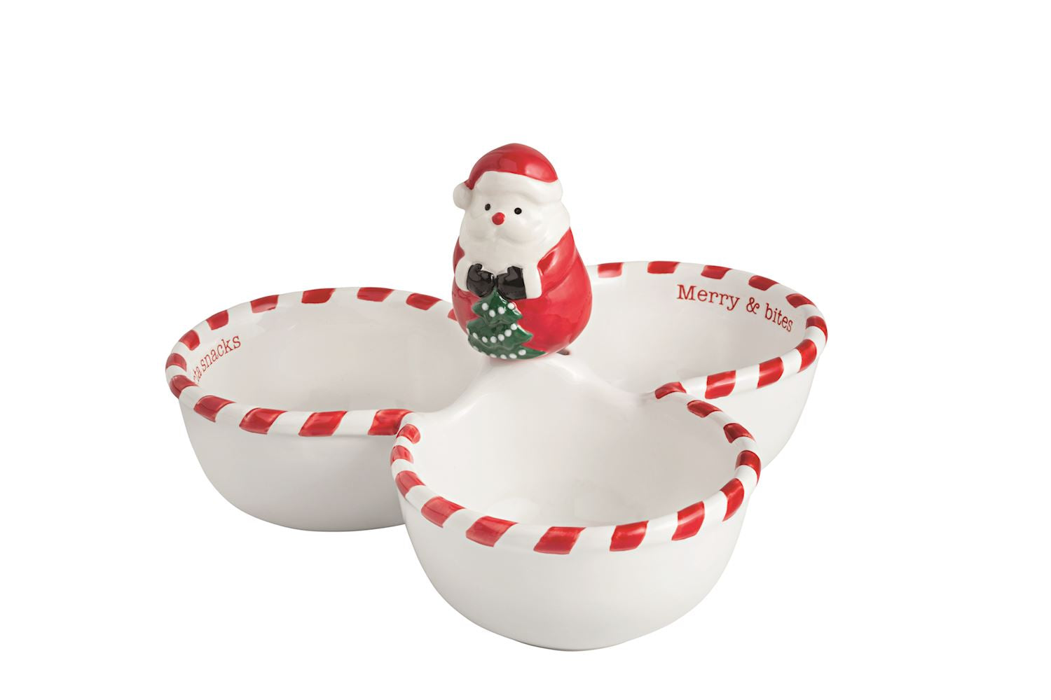 2-piece set. Hand-painted ceramic triple dip server features center slot to hold included stainless steel spreader with ceramic Santa handle